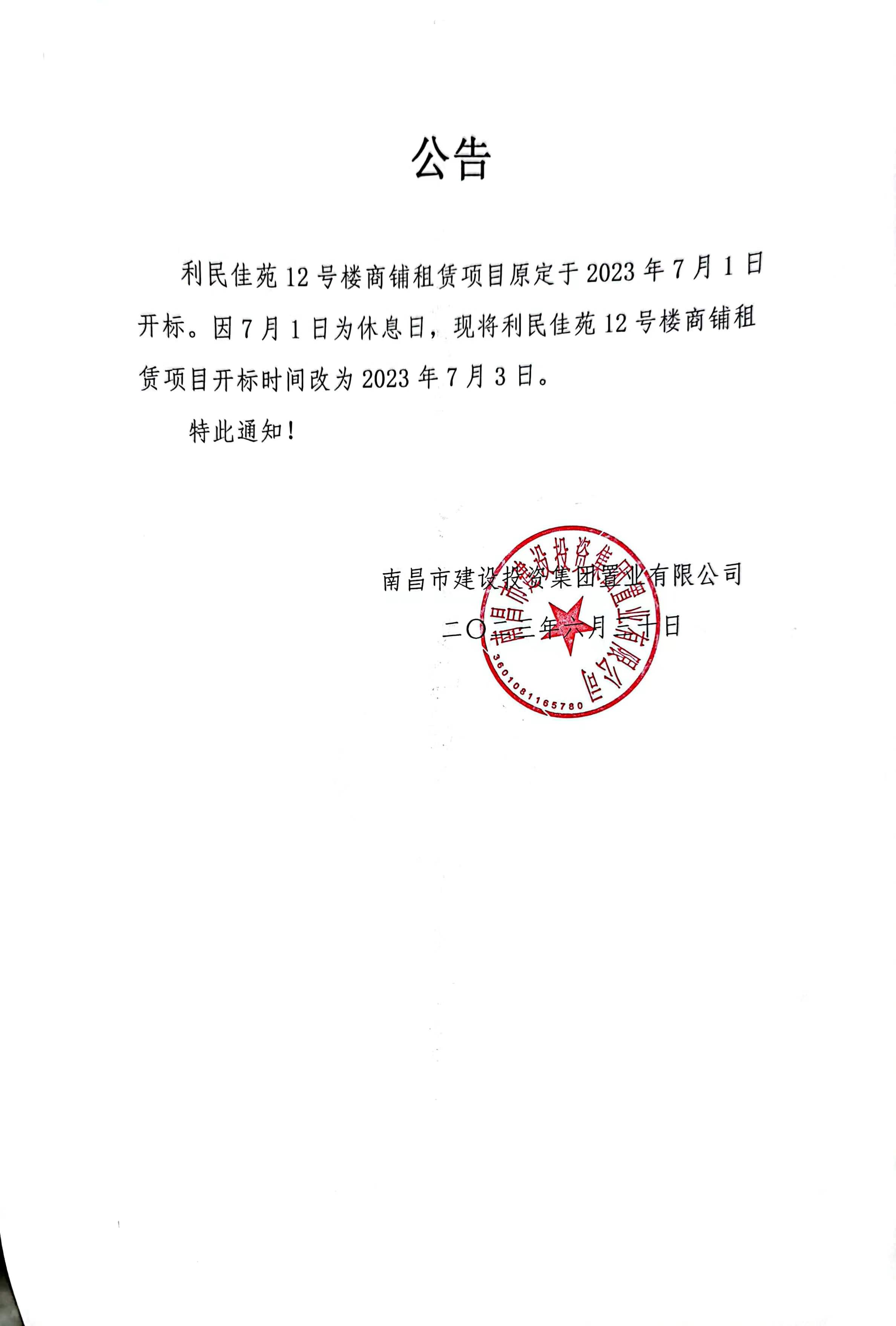 公告(关于修改利民佳苑12号楼商铺租赁项目开标时间的公告)